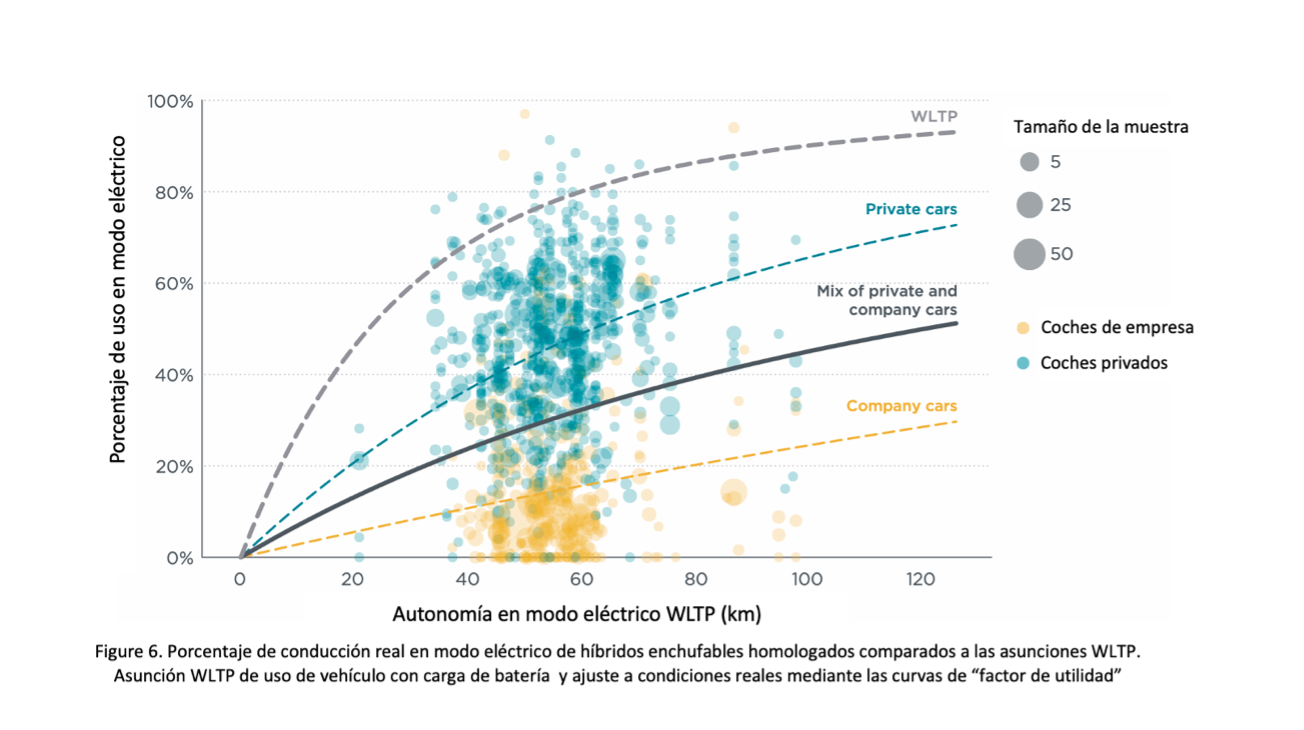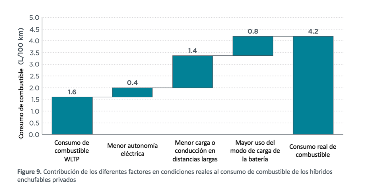 El estudio realizado por el ICCT (International Council on Clean Transportation) pone de manifiesto que los consumos de combustible registrados en vehículos privados son, en promedio, entre 4 y 4,4 litros a los 100 kilómetros para los vehículos privados y entre 7,6 y 8,4 litros a los 100 en coches de empresa y flotas. Estos datos están muy muy lejos de los consumos homologados para este tipo de vehículos, que suelen estar en torno a los 1,5 litros a los 100.