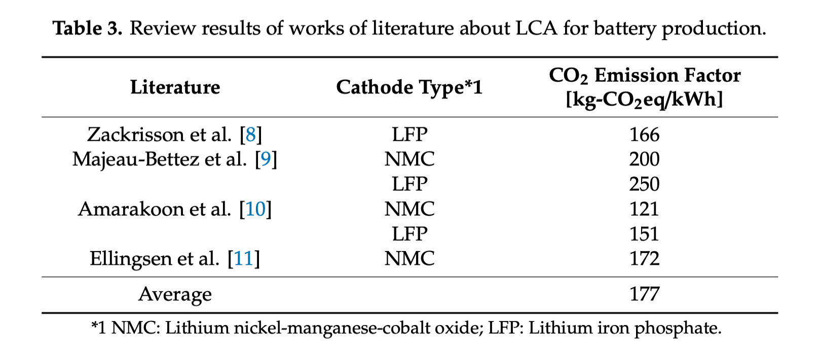 Como en el caso anterior se realiza un análisis diferenciado en función de la química de la batería, aunque en promedio concluye que podríamos considerar 177 kgs de CO2 por kWh. Esto nos llevaría para un vehículo de 60 kWh a 10,6 T., cifra recogida en la infografía de síntesis que es la más pesimista de todas las estimaciones recogidas.