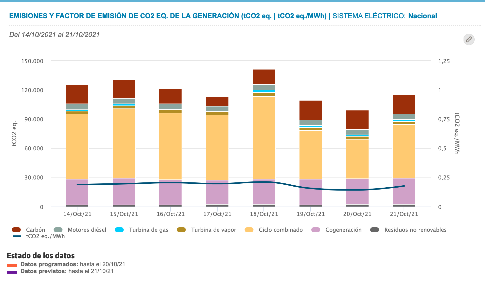 Red Eléctrica de España publica diariamente las emisiones de CO2 por kWh producido mediante fuentes no renovables, a fecha 01/10/2021 este valor se situaba en 0,18 tCO2 / MWh lo que equivale a 180 gr. CO2 por kWh. Enlace hacia Red Eléctrica Española.