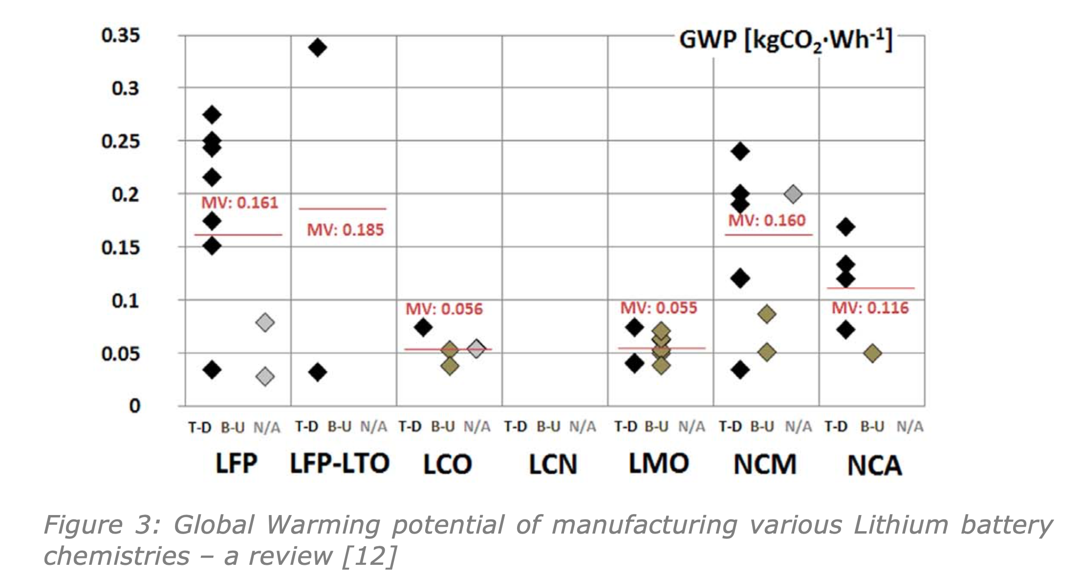 En este estudio se lleva a cabo un análisis de las emisiones para baterías concretas, diferenciando en función de la química de la misma. Las emisiones varían entre 40 y 350 kg de CO2 / kWh con una media de 110.