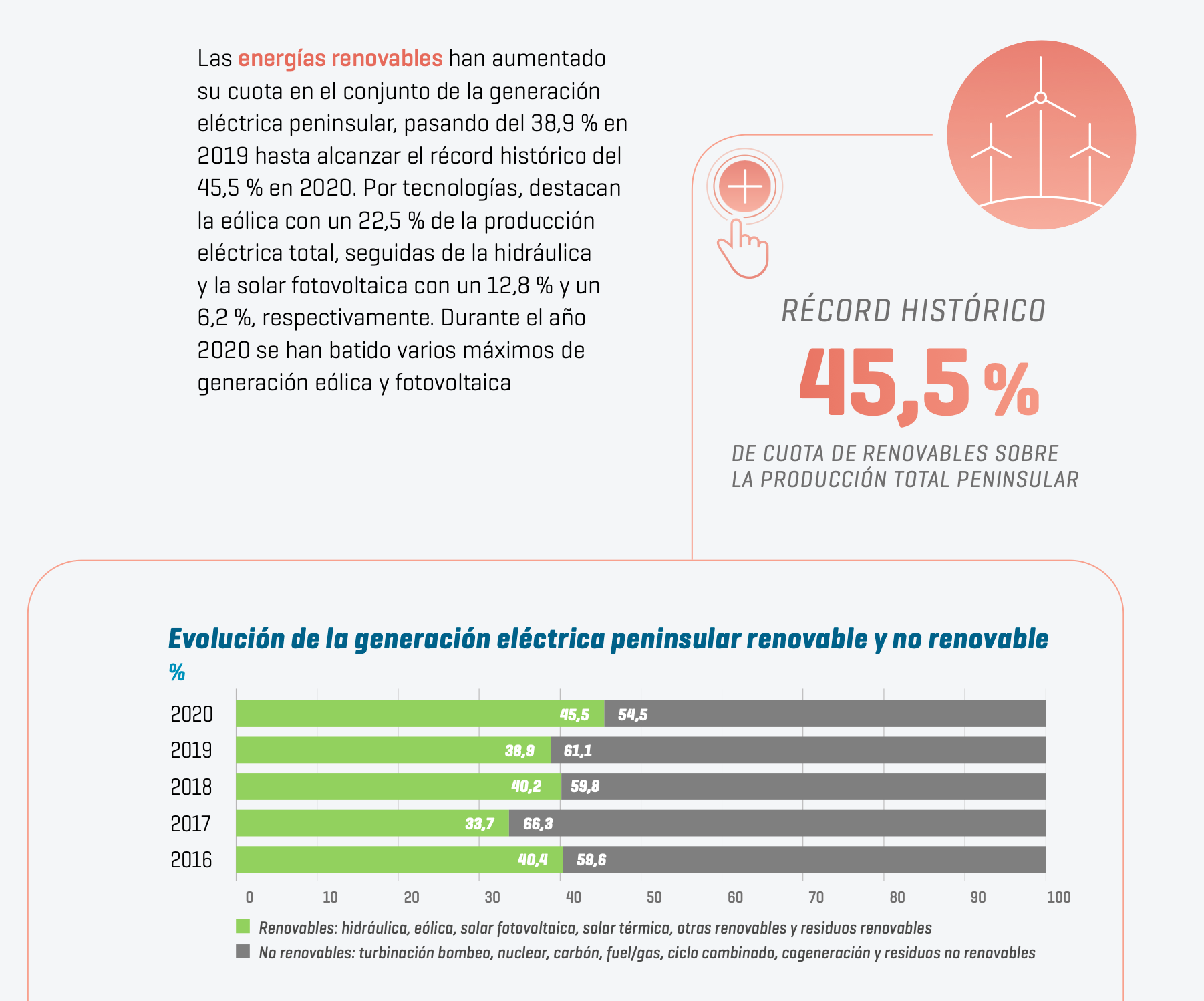Según la publicación realizada por Red Eléctrica de España, “Avance del Informe del sistema eléctrico español”, editado en febrero de 2021, la contribución media en España de energías renovables fue en 2020 de un 45,5%.
