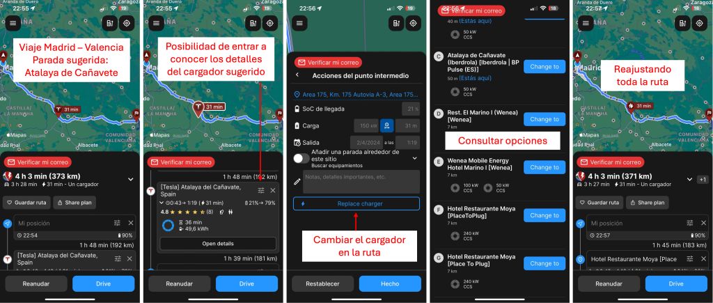 El Planificador de rutas de Tesla está muy optimizado en general, y es un referente en muchos aspectos, pero siempre limita la oferta de carga a su propia Red de Supercargadores. Esto lleva a que muchos de los cargadores muy cercanos a los puntos donde se han registrado mayores incidentes estuvieran desocupados mientras que los Supercargadores de Tesla estaban saturados. - Existen por supuesto herramientas de planificación de terceros que funcionan bien, pero creemos que aún tienen carencias, en gran medida estas carencias son consecuencia de la dificultad de recibir información de los propios cargadores en tiempo real. Algunos ejemplos son ABRP (A Better Route Planner) o Chargemap. También hay agregadores de puntos de carga que nos permiten conocer el estado de dichos Puntos de Carga y las valoraciones de usuarios, como Electromaps.